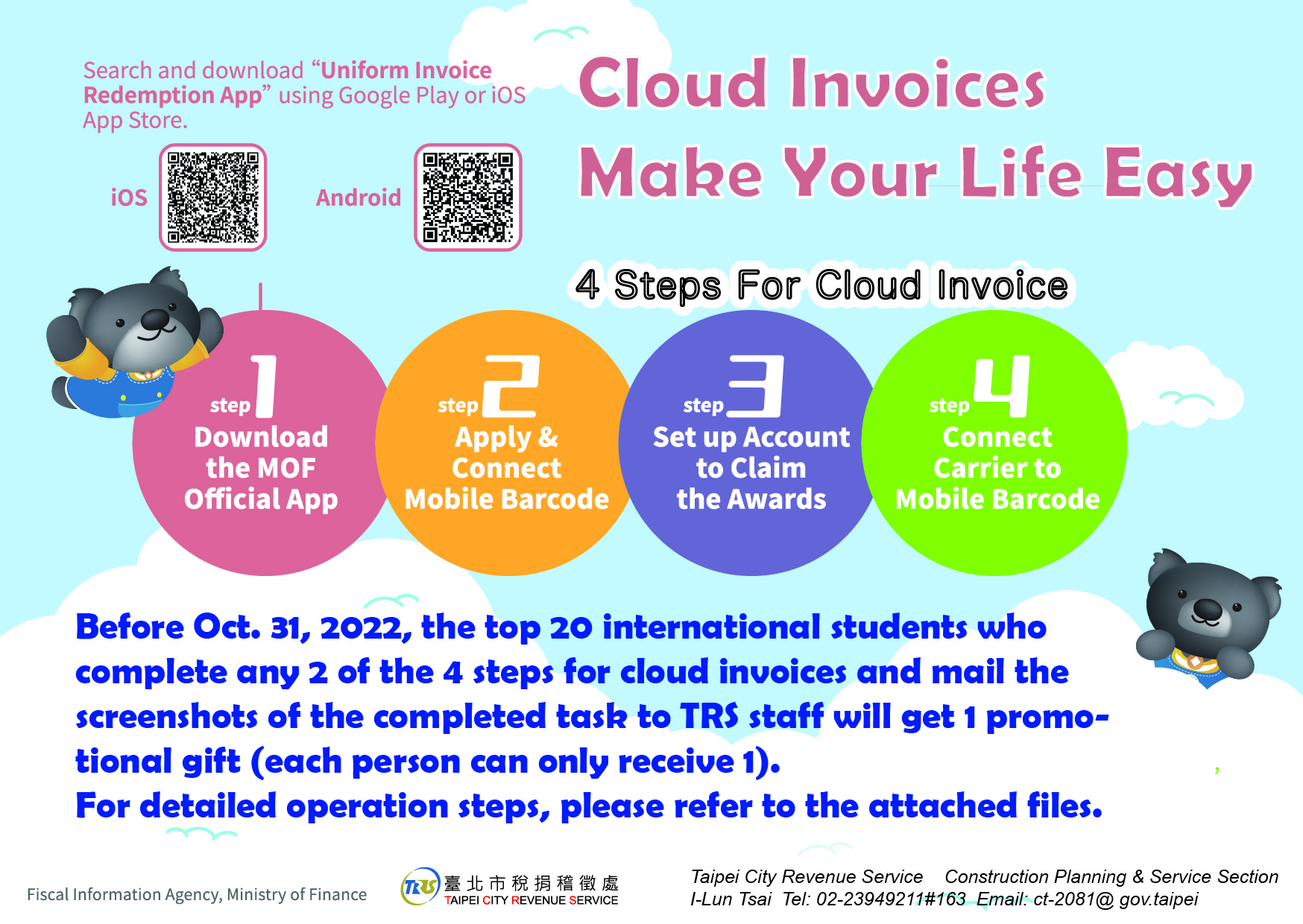 Before Oct. 31, 2022, the top 20 international students who complete any 2 of the 4 steps for cloud invoices and mail the screenshots of the completed task to TRS staff will get 1 promotional gift (each person can only receive 1).