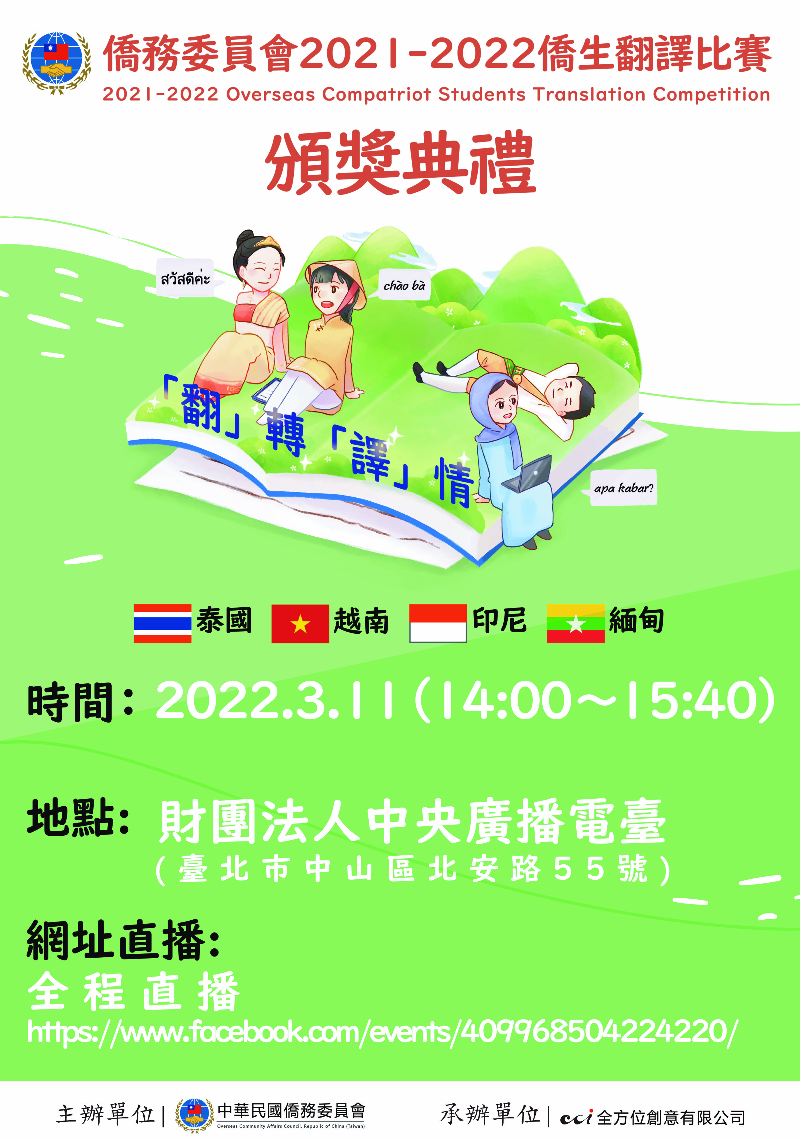 「2021-2022年僑生翻譯比賽」頒獎典禮訂於3月11日(星期五)14:00-15:40於財團法人中央廣播電臺舉行,當天FB全程直播,請鼓勵學生在不影響課程或實習之餘,踴躍觀看線上直播,冀能見賢思齊策勵未來!