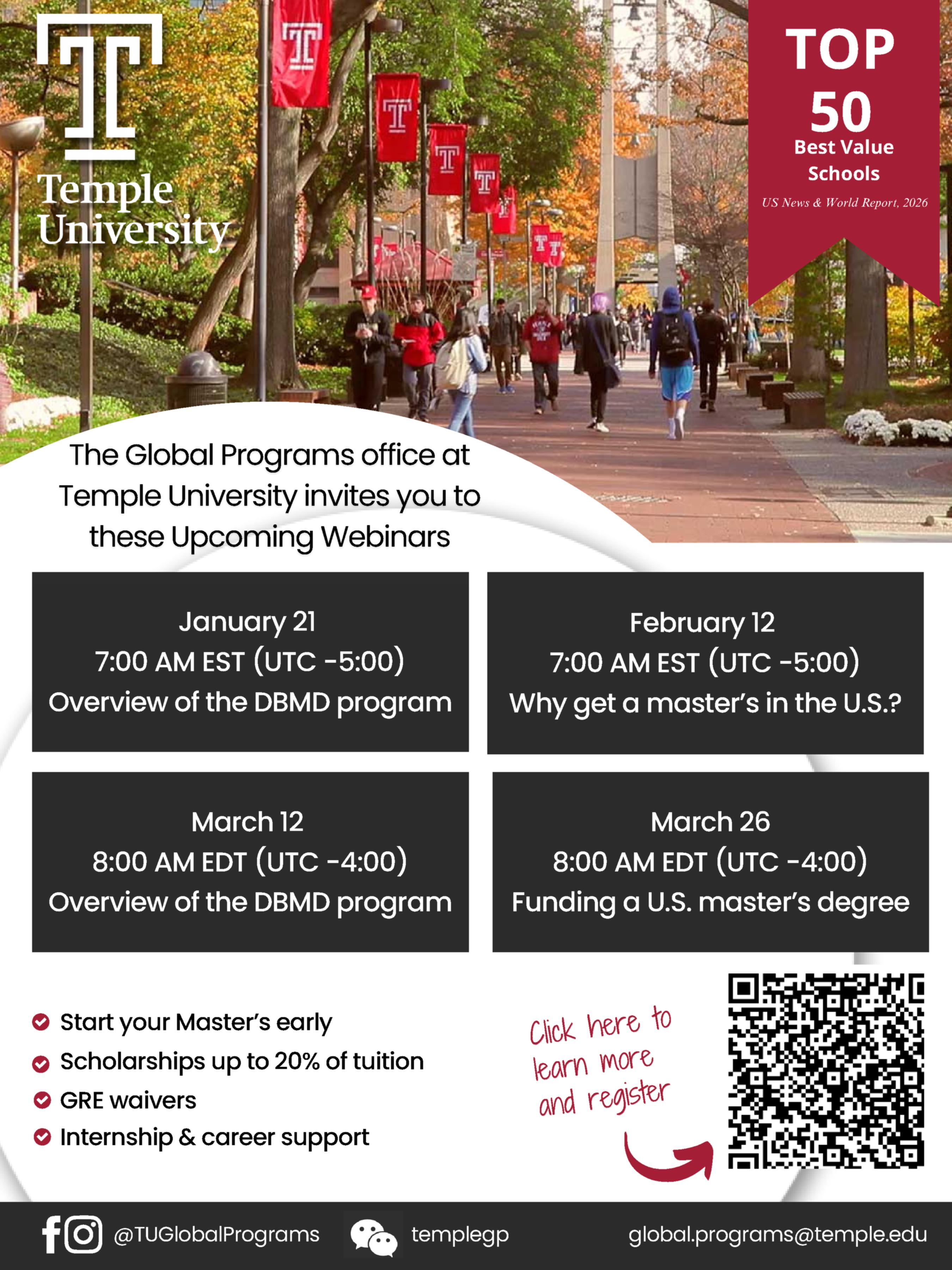 為協助學生深入了解天普大學(Temple University)的學術環境及 DBMD 雙聯碩士計畫的優勢,姊妹校特別規劃了一系列線上說明會。後續也將陸續推出各類專題講座,包含校內系所座談、在校生經驗分享,以及專為華語學生設計的中文說明會。歡迎有興趣的同學參加!