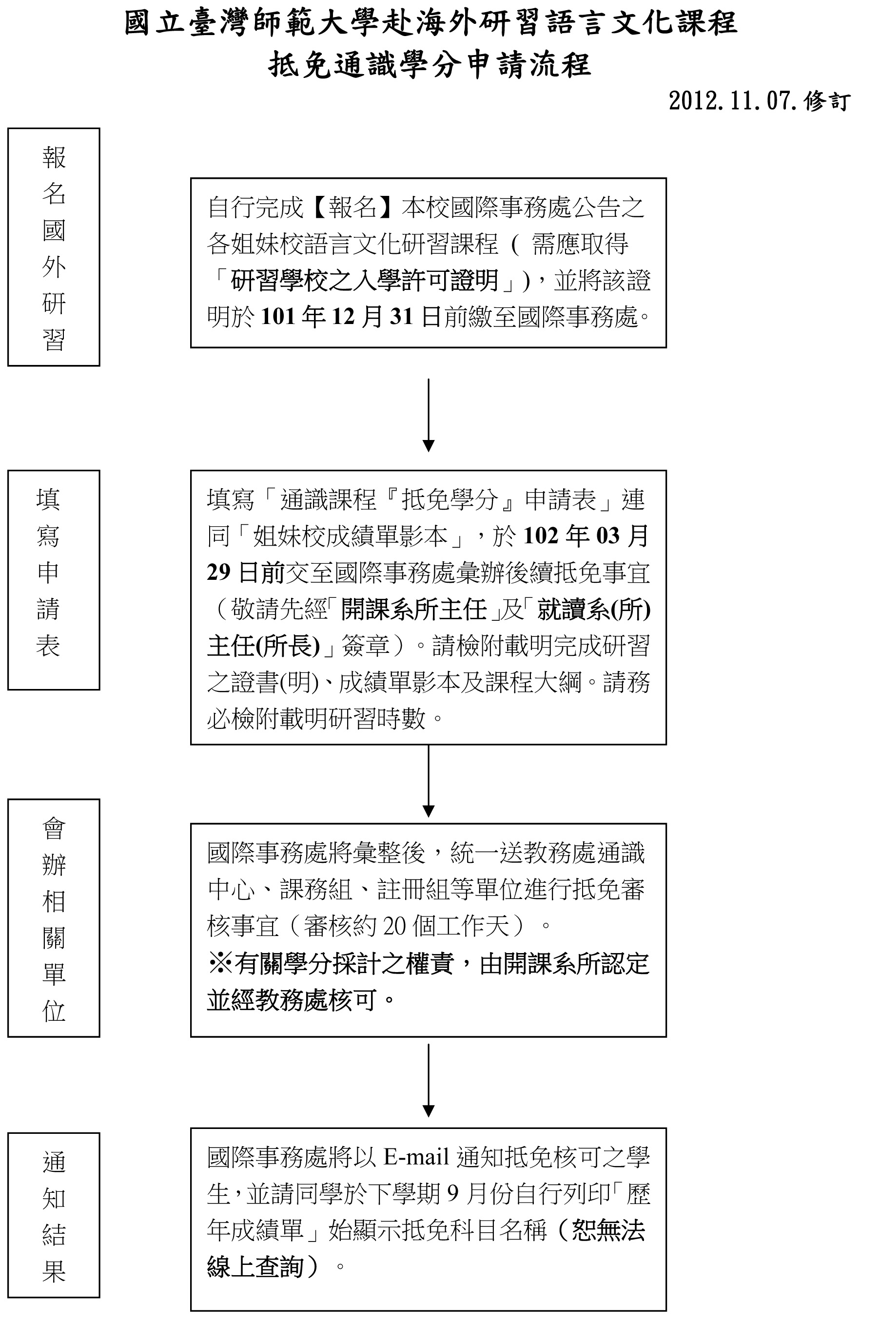 五、於2013年03月29日前,檢附相關證件交至國際事務處統一辦理後續教務 處通識中心及註冊組等相關作業。