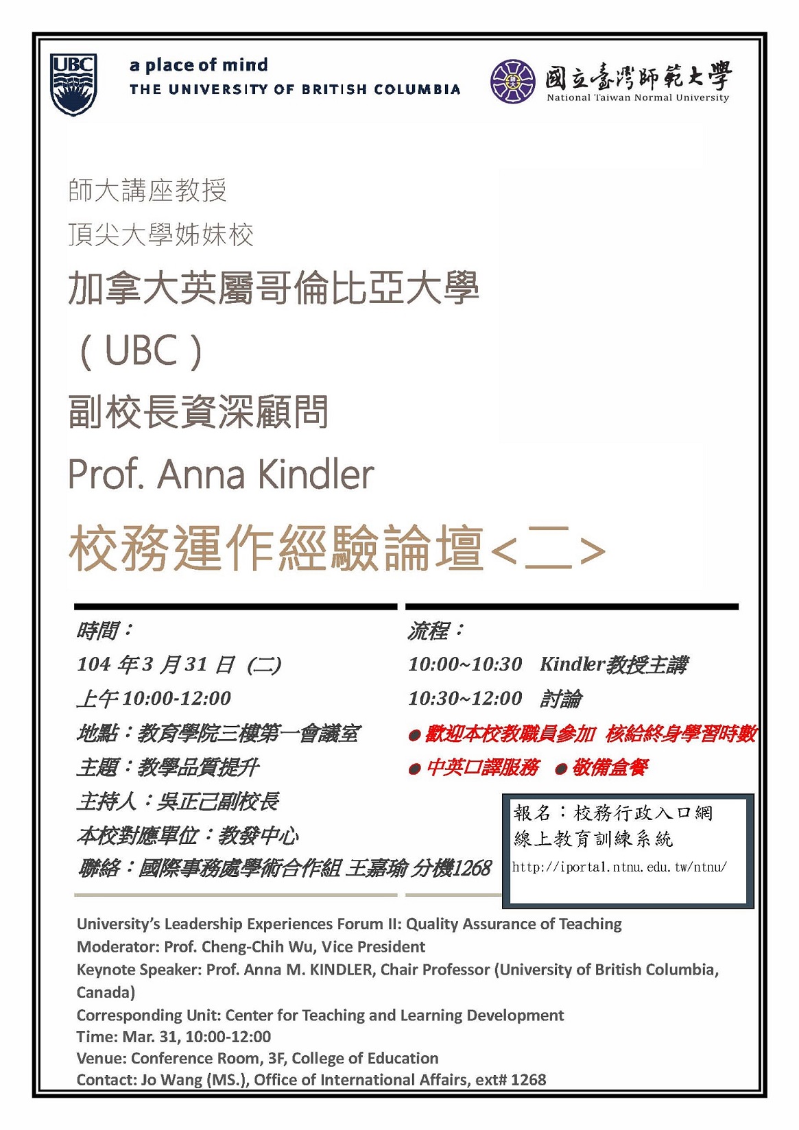 2015/03/31 -【姊妹校】UBC校務運作經驗論壇二:教學品質提升<3/31上午>
