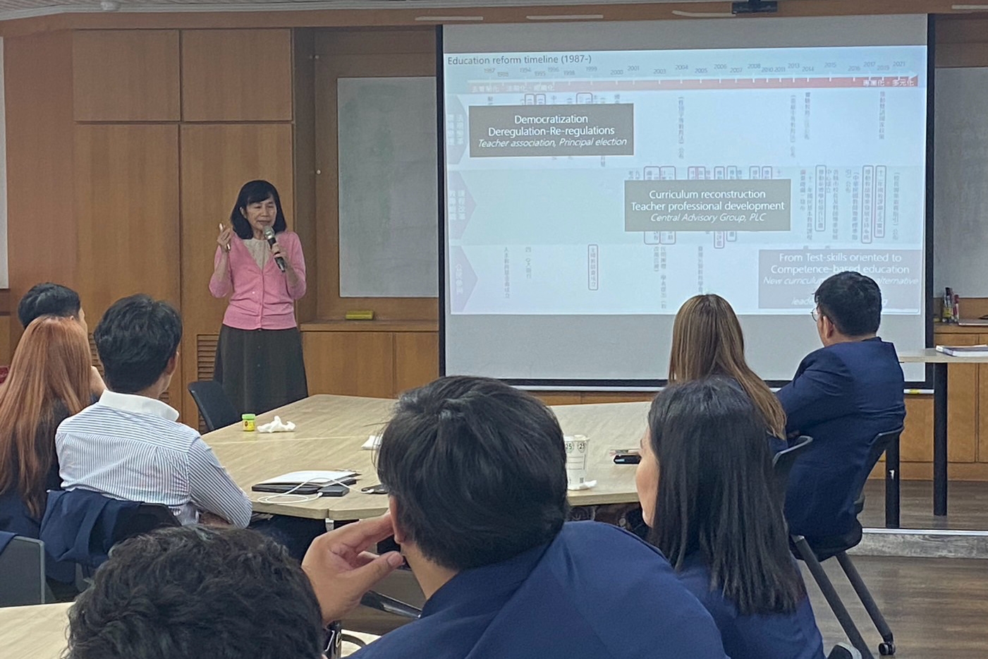 當天下午參訪活動的高潮是教創中心陳佩英主任所分享的臺灣教育改革脈絡以及校長領導的轉變,並以在臺灣推行15年的高中優質化輔助方案為例,為泰國師生說明政府、學界與高中學校合力推動高中學校變革與領導培力的過程。