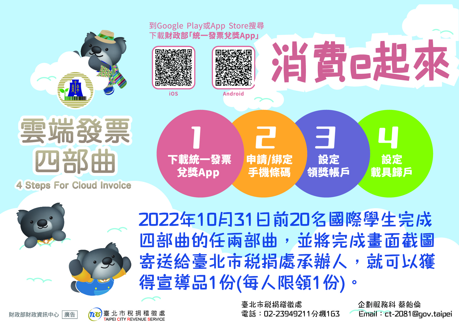 By 臺北市稅捐稽徵處 消費時取得的紙本發票,常遺忘收到哪裡? 發票開獎時,攤開紙本發票一張一張對到眼花撩亂? 下載統一發票兌獎App,發票存入載具,煩惱通通搞定! 雲端載具短片 即日起至2022年10月31日前20名境外生完成四部曲的任兩部曲,並將完成畫面截圖寄送給臺北市稅捐處承辦人,就可以獲得宣導品1份(每人限領1份)