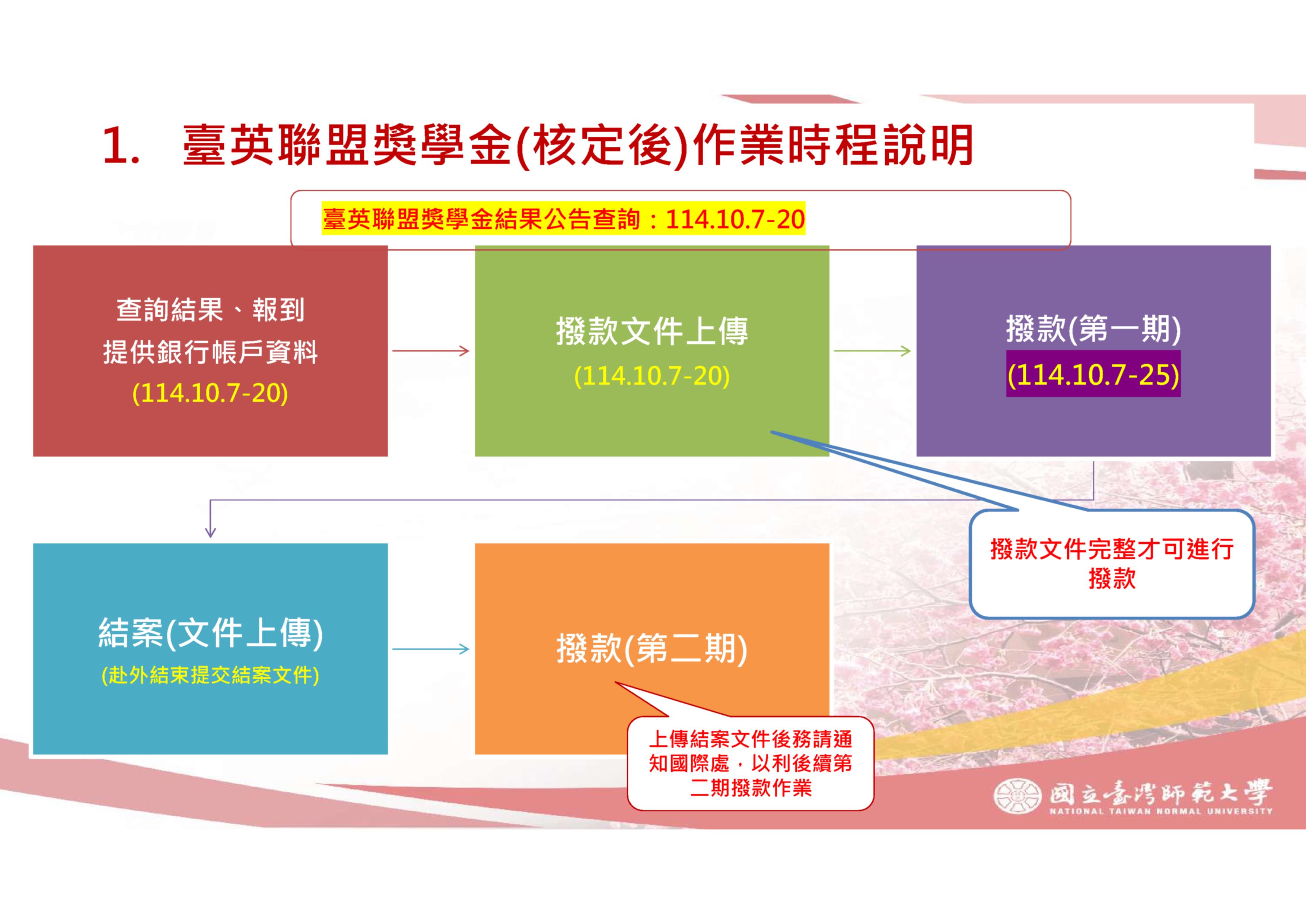 【臺英聯盟獎學金】核定及撥款通知,務請獲核者於114.10.07-25至【赴外獎學金系統】完成報到及撥款文件上傳及提交,以利後續撥款作業。