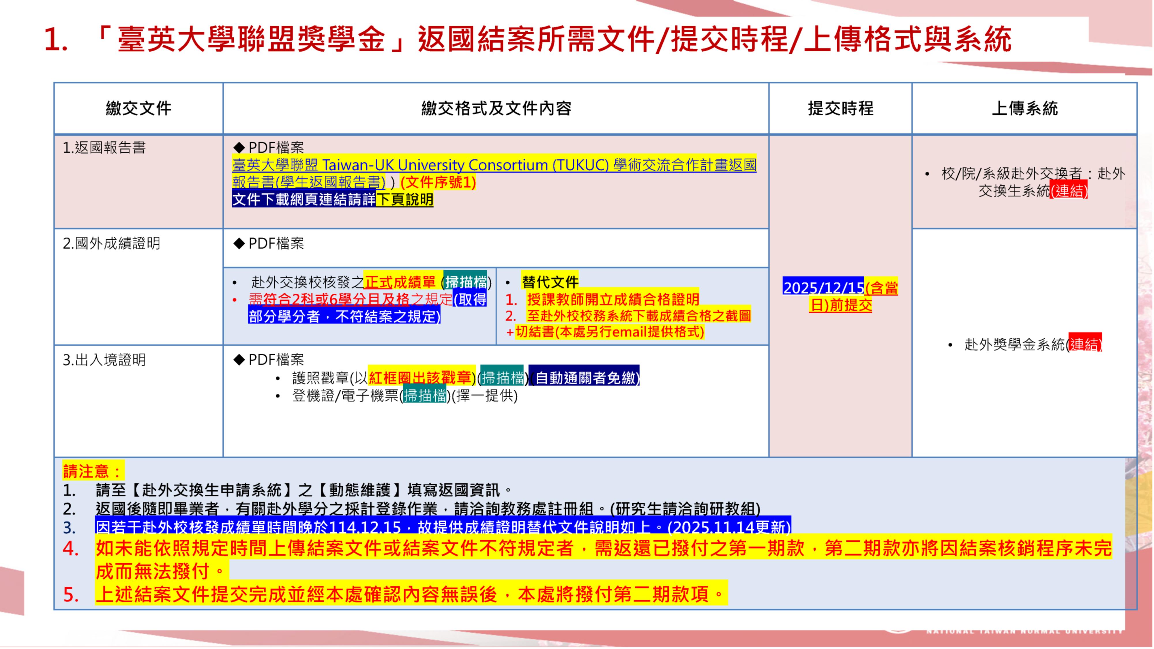 【臺英聯盟獎學金】結案相關流程說明,務請於114.12.15前提交相關結案文件,以利撥付第二期款及結案作業。
