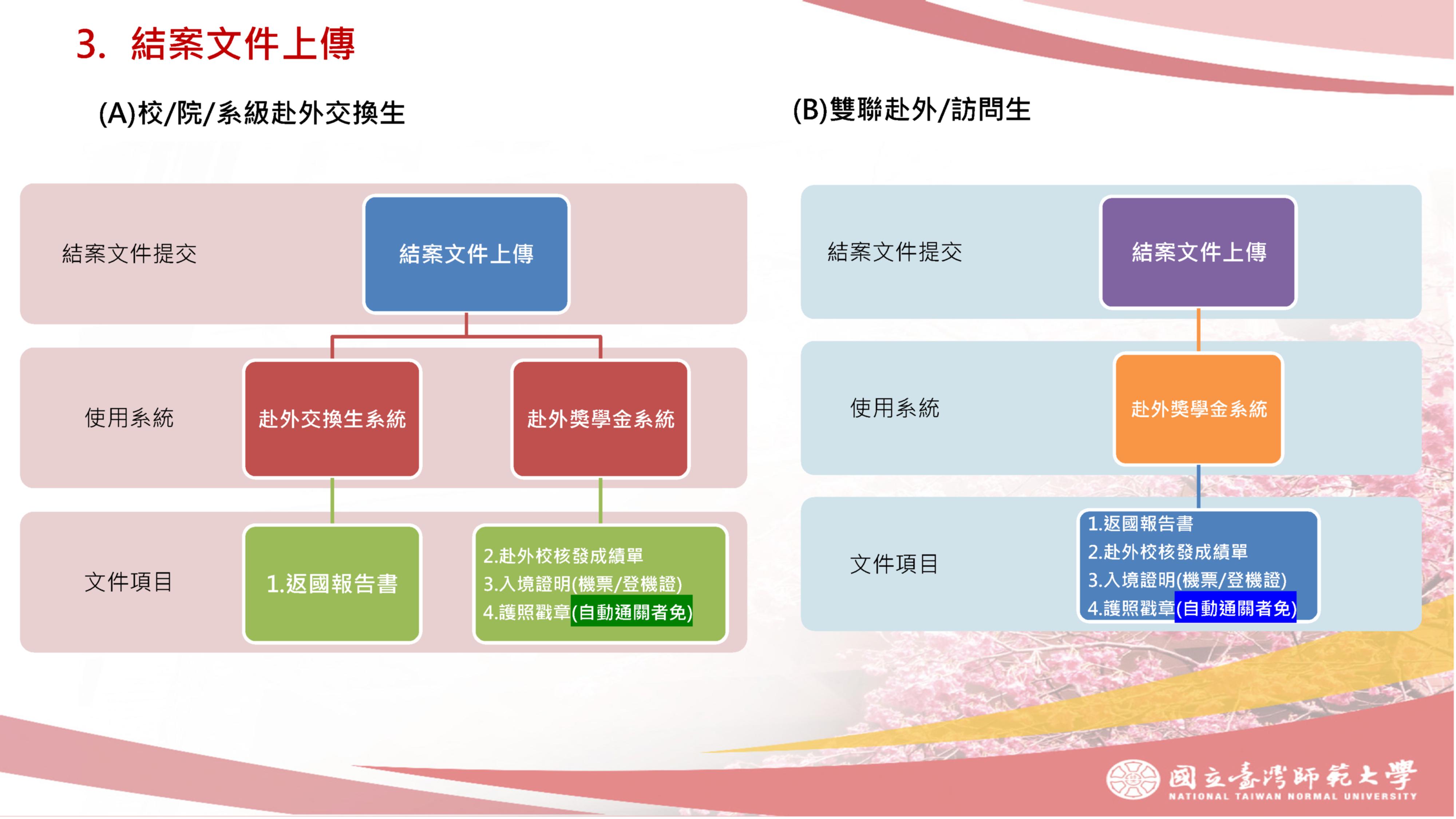 - 文件清單與格式: 請參考附檔**【返國流程說明】**中的相關內容,以確認所有返國所需文件、提交時程以及上傳系統的要求。