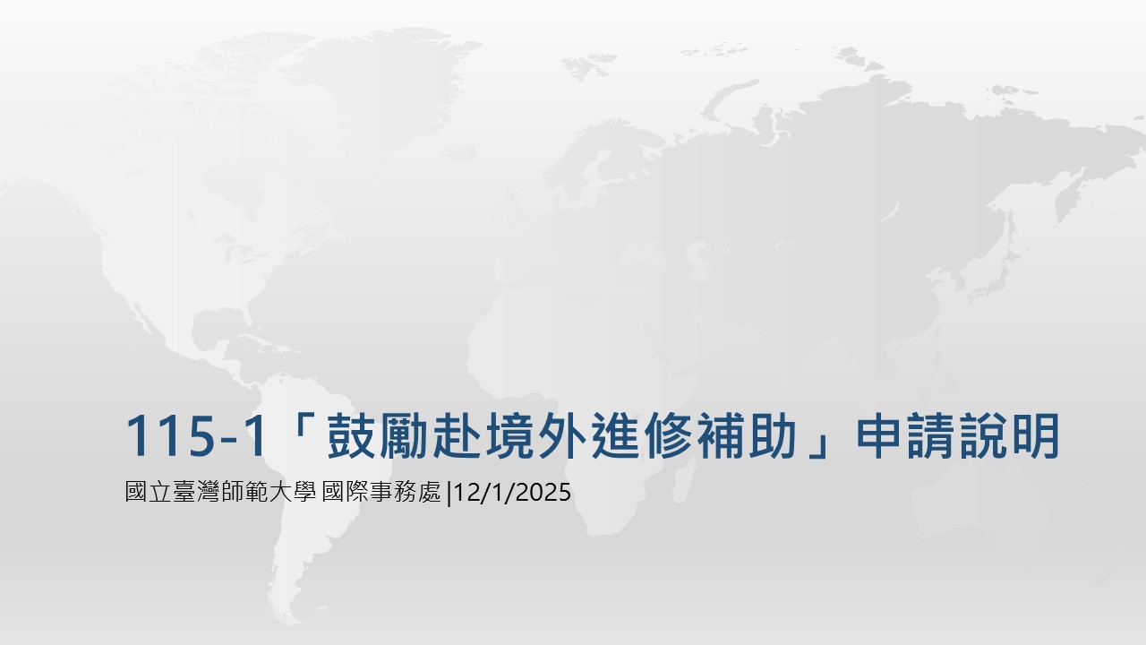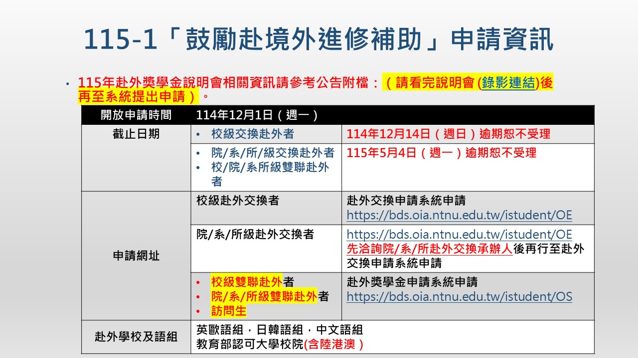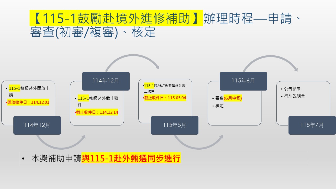 【獎補助公告】115-1鼓勵赴外申請開放中(校級赴外:114.12.1-14,院/系/所及雙聯訪問:114.12.1-115.5.4),務請把握時程提出申請。