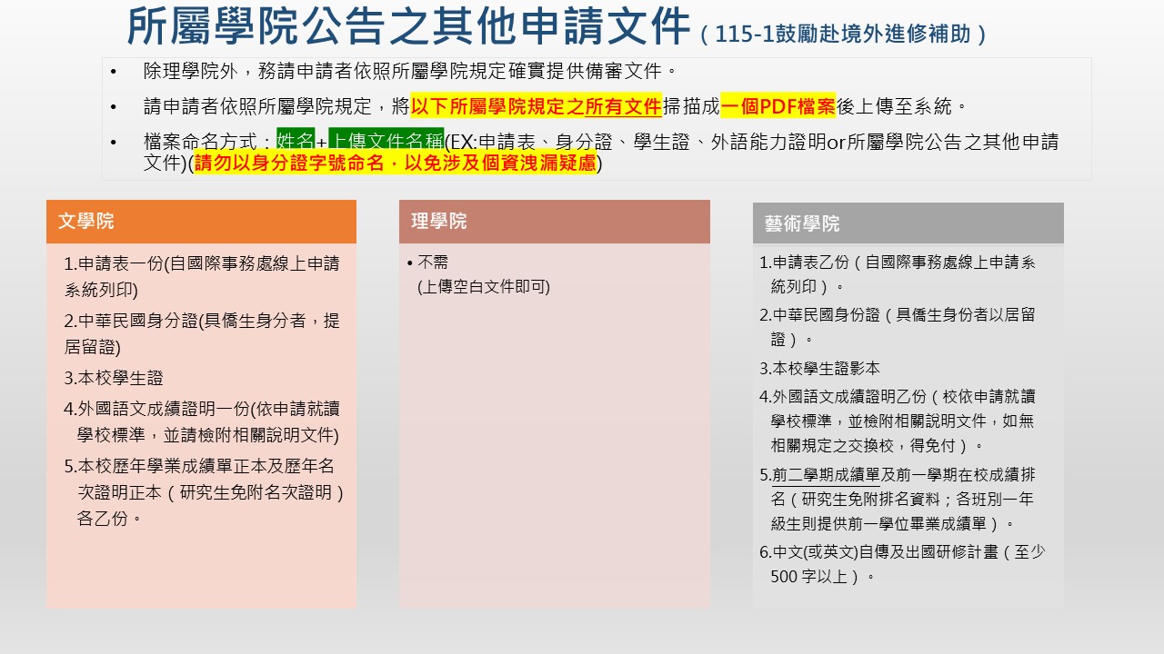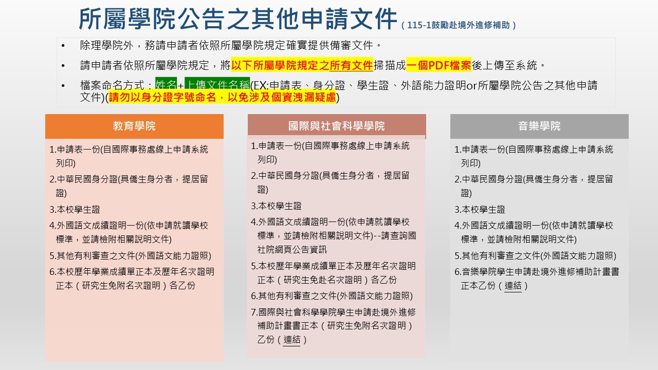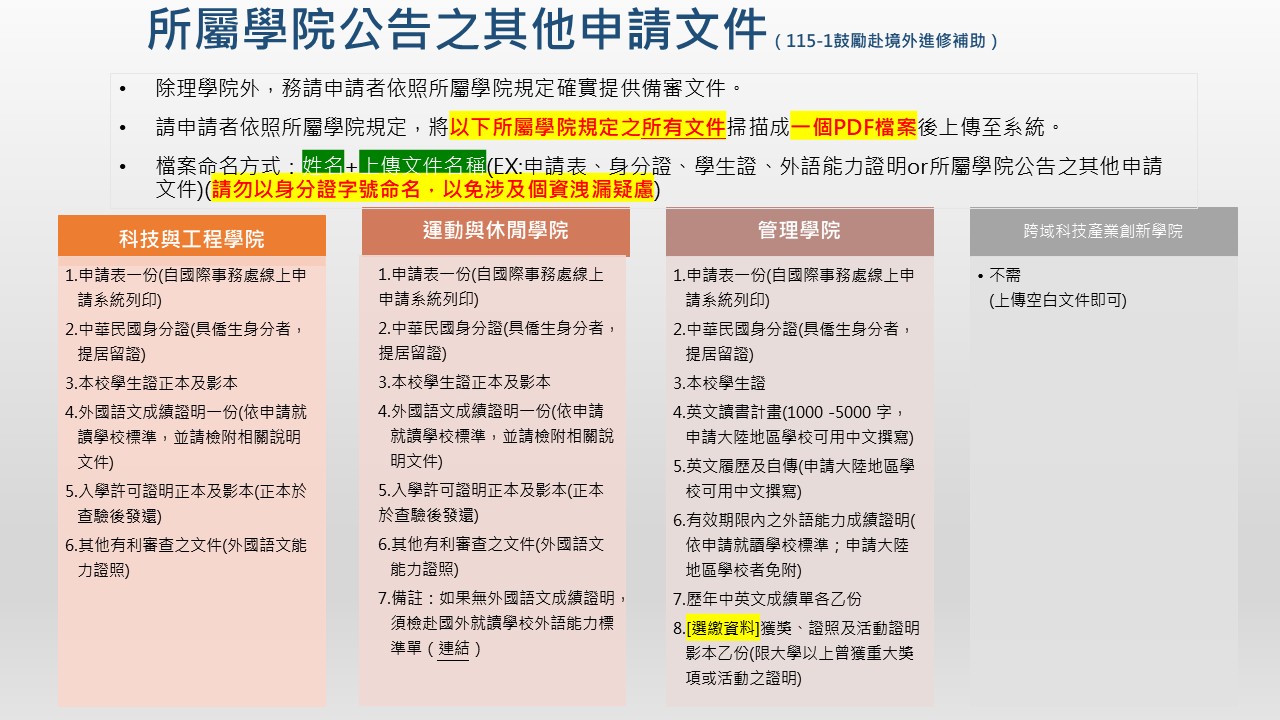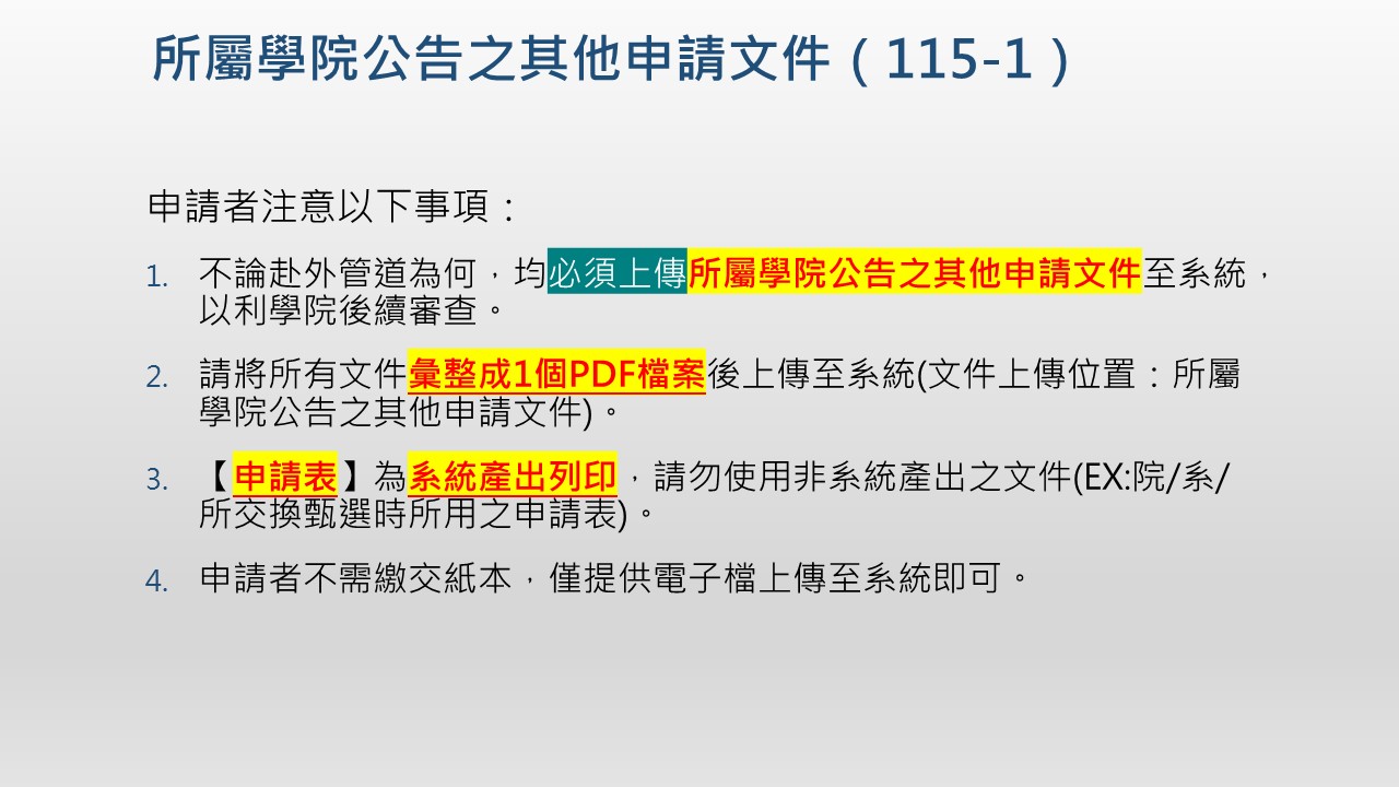 所屬學院公告之其他申請文件 (請參考本公告附件二-所屬學院公告之其他申請文件(115-1))。 |