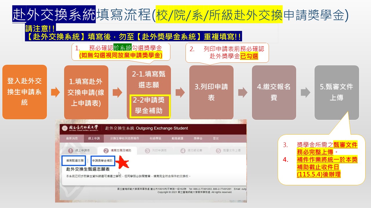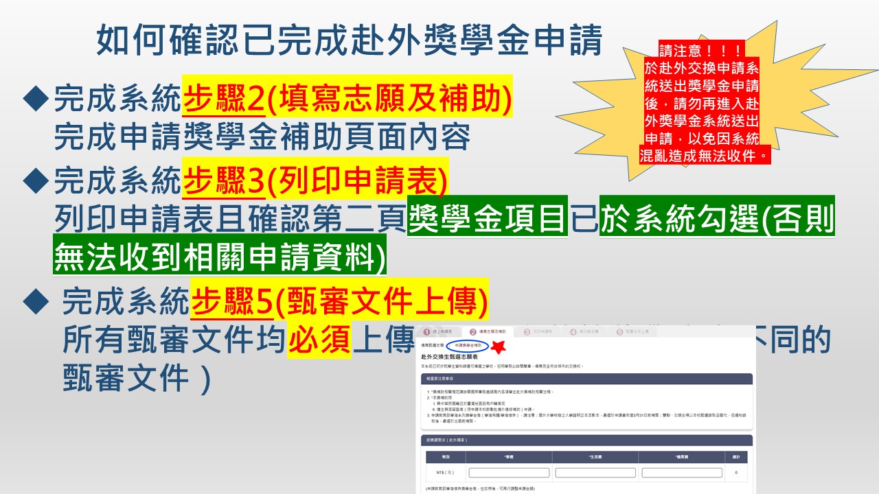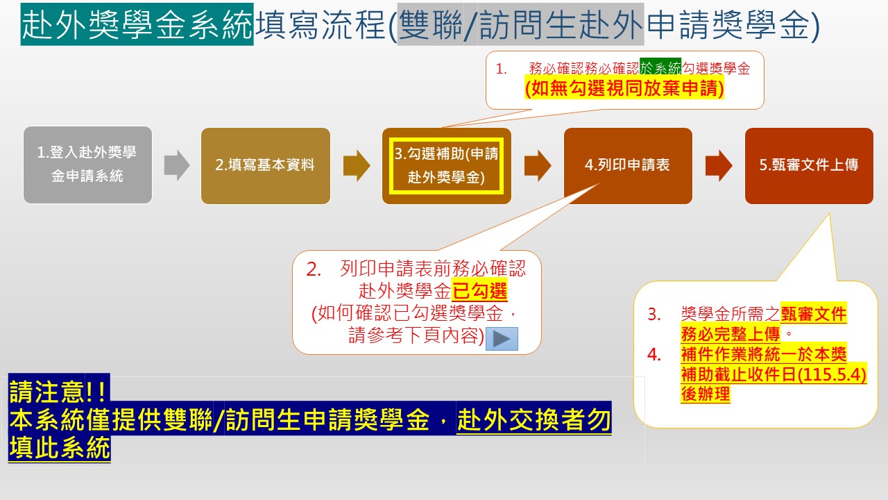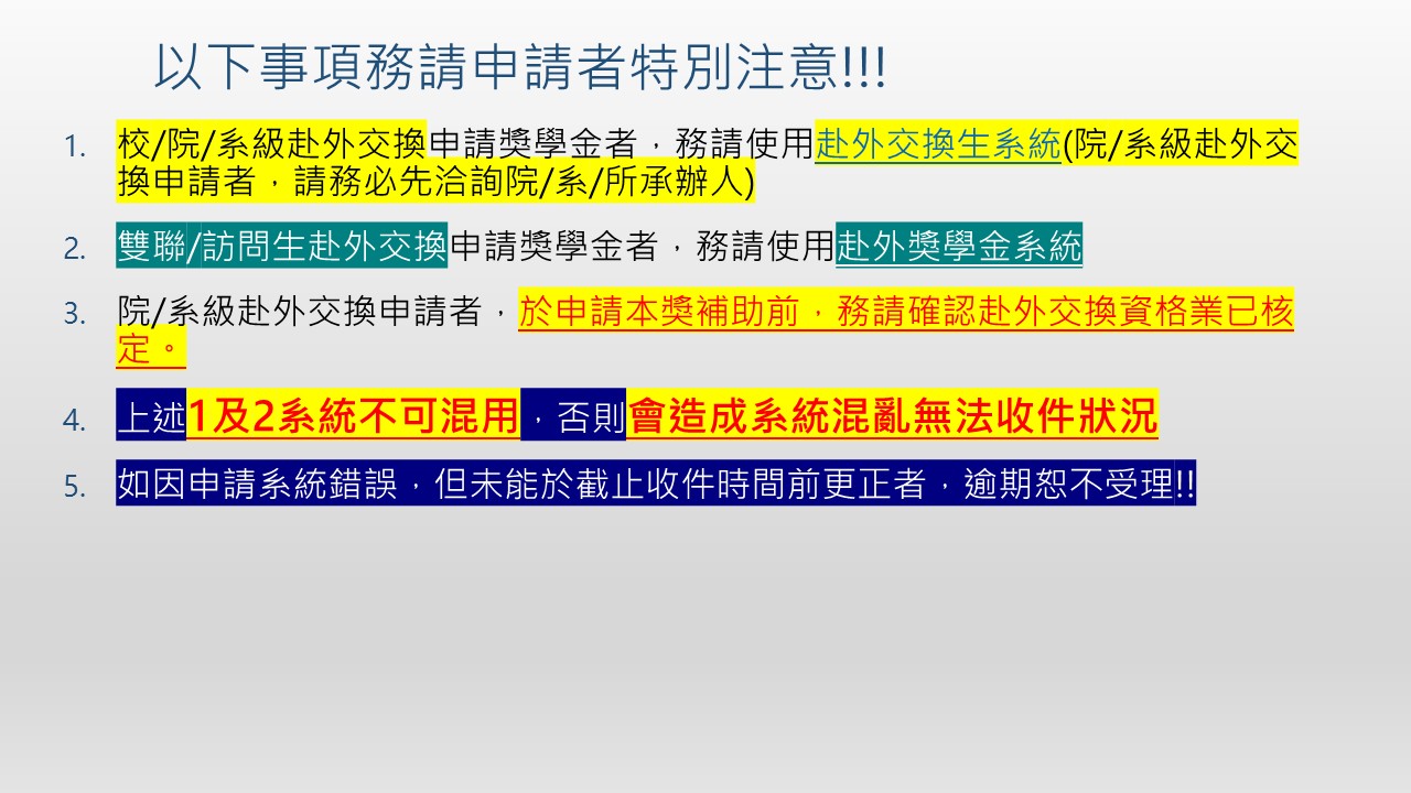 - 【赴外交換系統】與【赴外獎學金系統】不可混合使用。如因使用錯誤系統而未能於截止收件日前更正,將不受理。