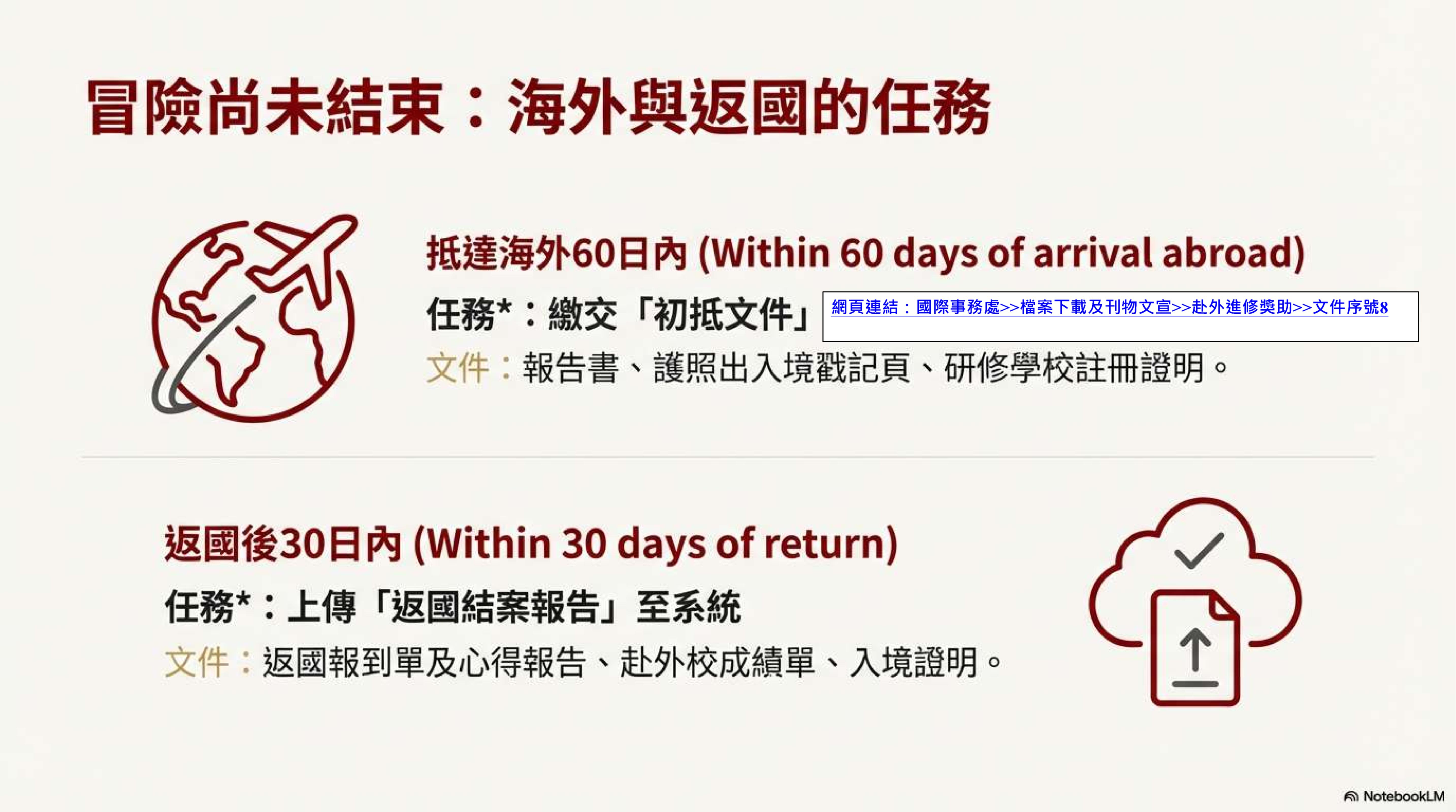 - 抵達回報: 抵達國外後 60 日內,需 Email 提交初抵報告