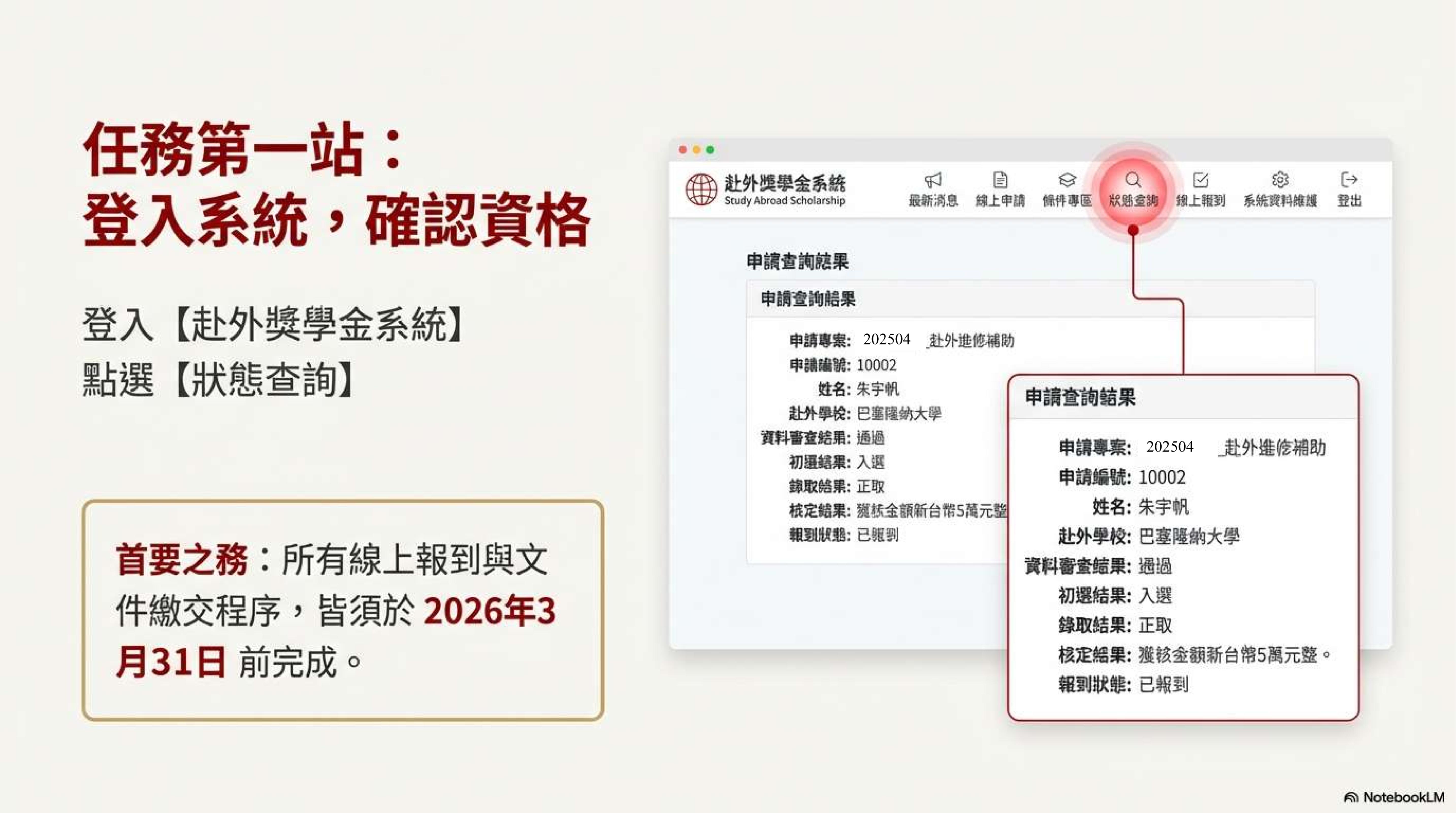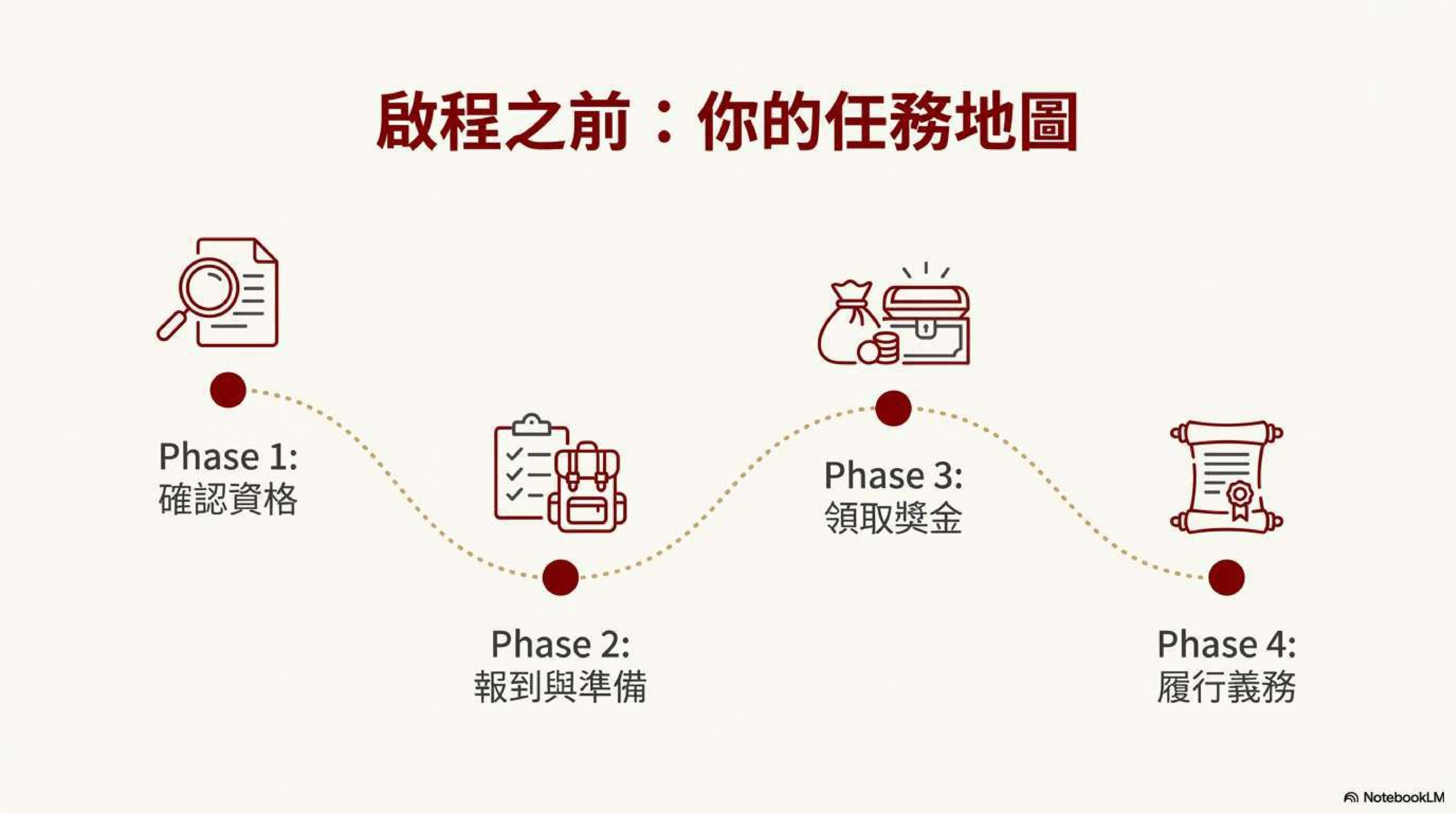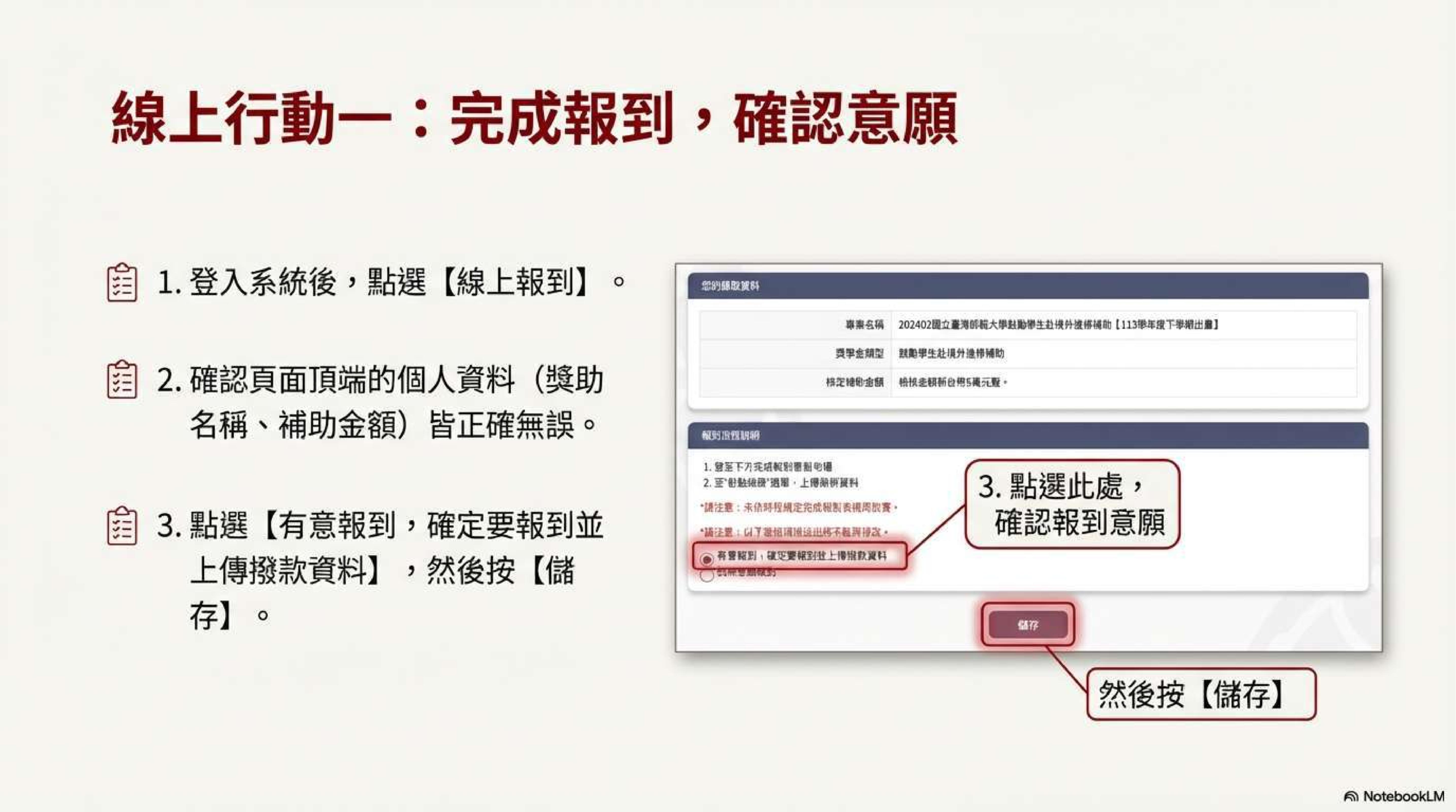 - 請務必依循以下流程,於 115 年 3 月 31 日前 完成報到與文件繳交,以確保補助款順利撥付。
