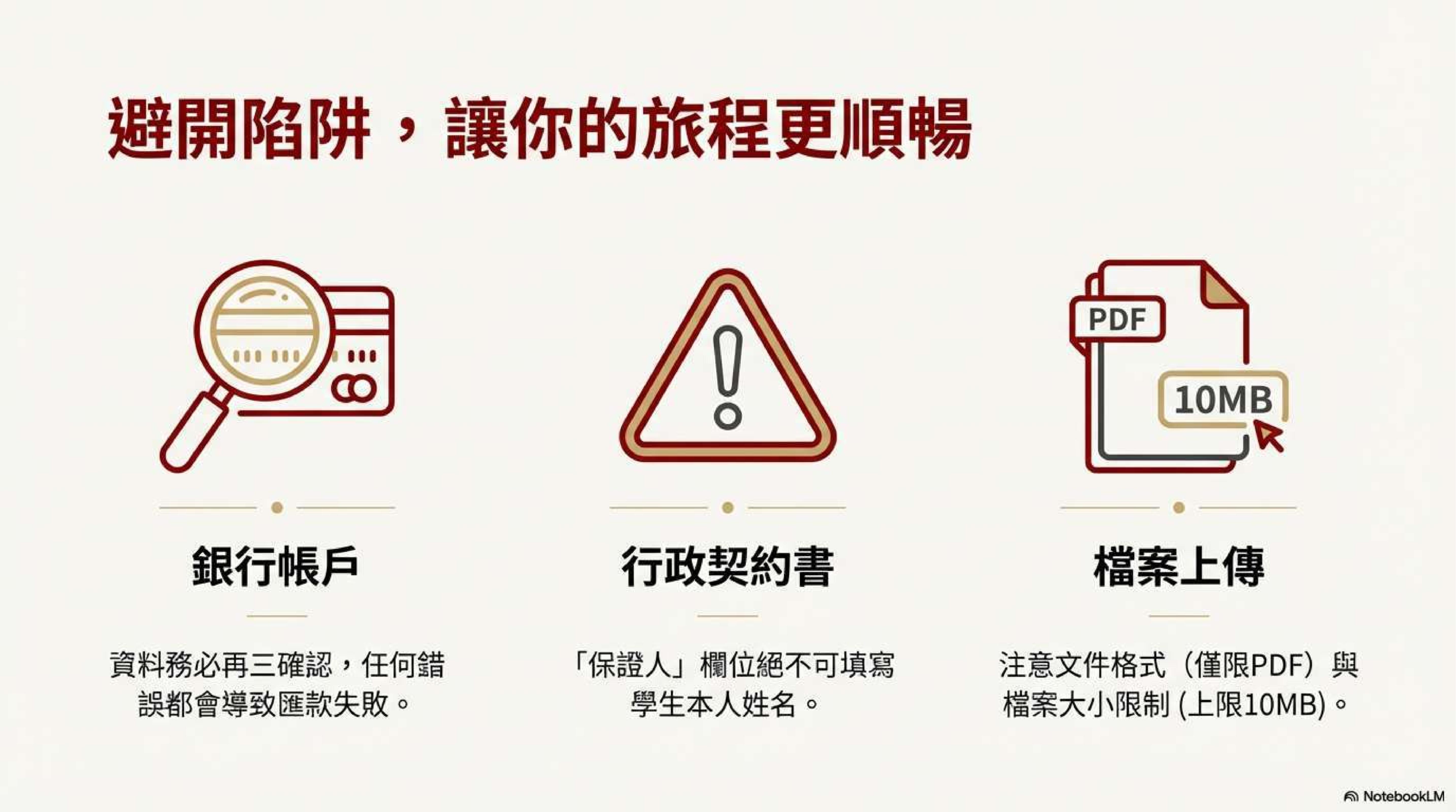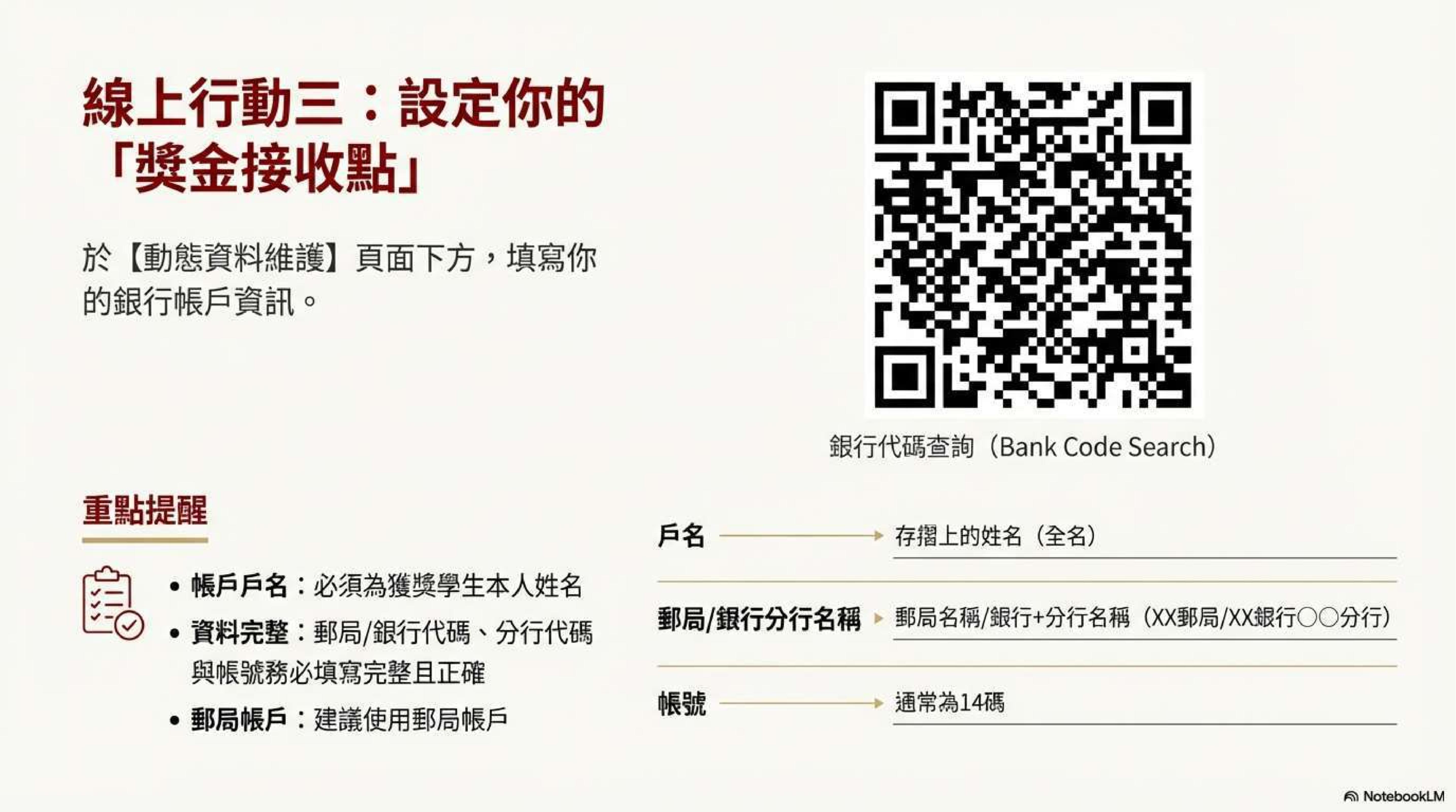- 銀行資訊: 必須為學生本人之「新台幣」帳戶。