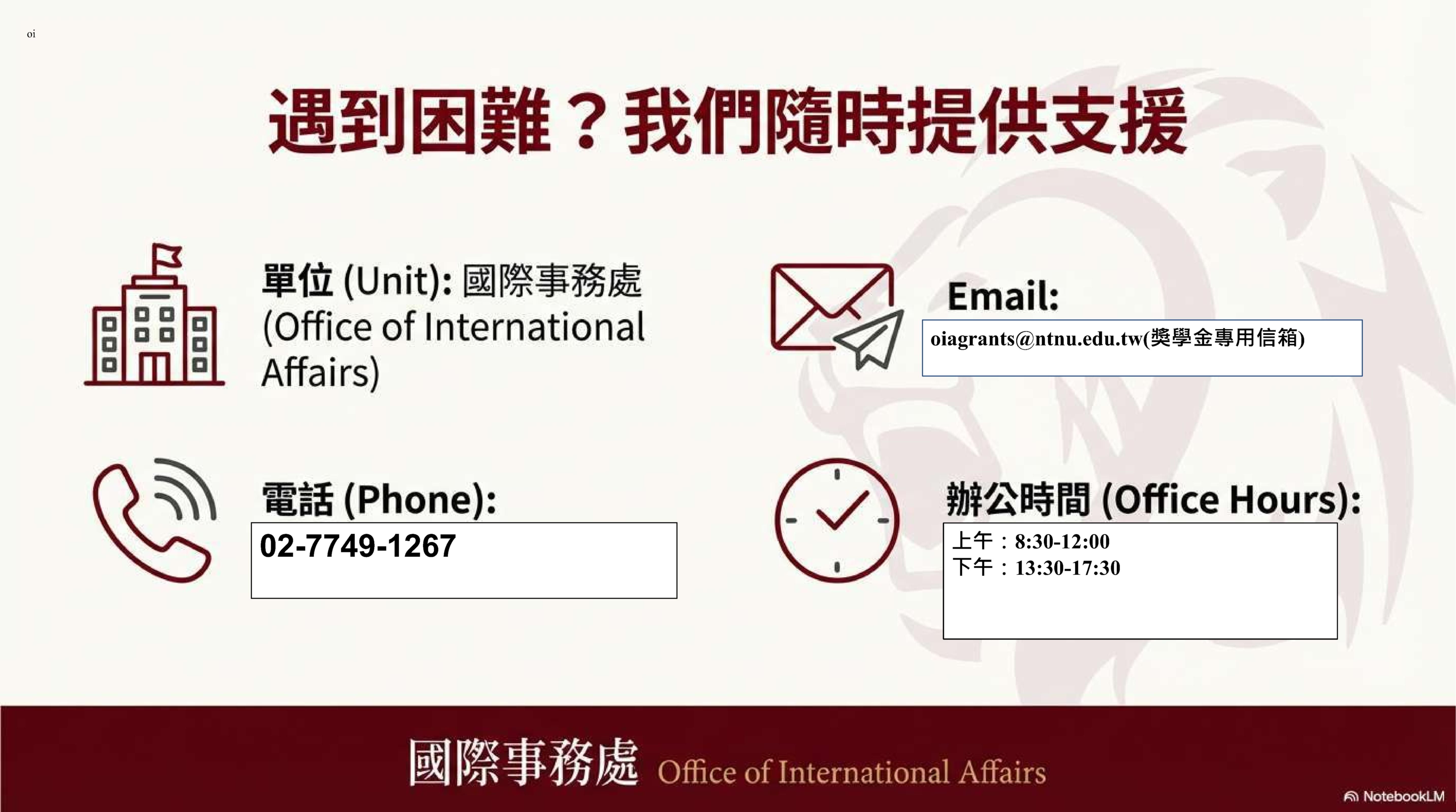 Email:oiagrants@ntnu.edu.tw(赴外獎學金專用信箱)