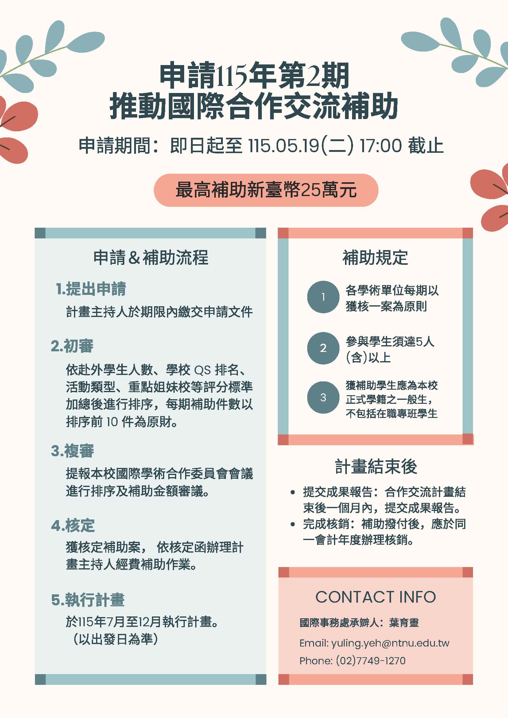 【獎補助公告】115年度第2期本校「推動國際合作交流補助」,即日起受理申請,115.5.19 (二) 17:00 截止