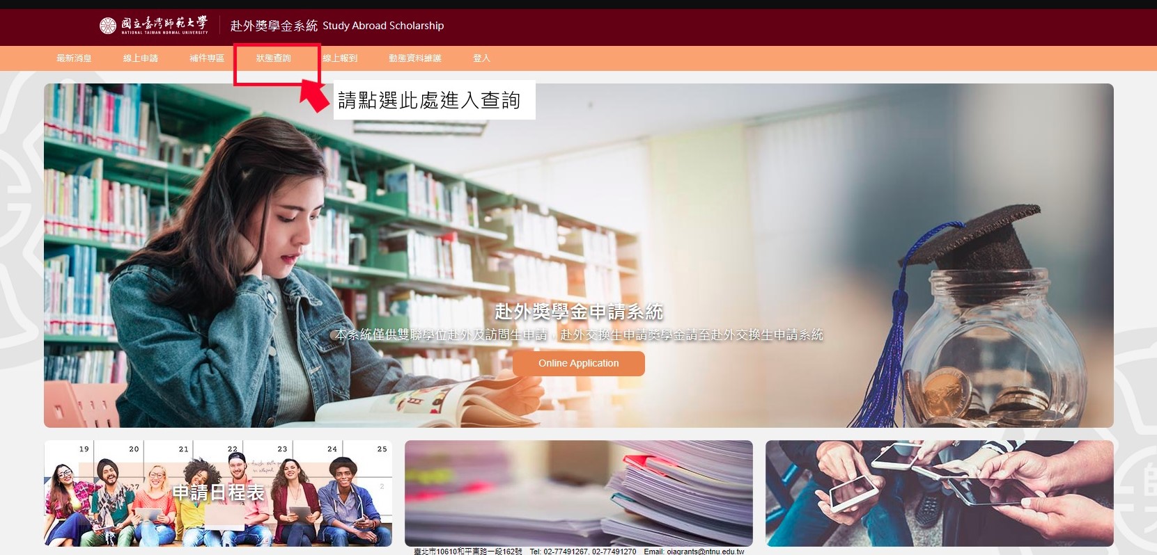 - 依本校國際學術合作委員會115年3月19日會議決議,旨揭補助之校內初選結果,請至赴外獎學金系統查詢。(如附圖:進入系統後,請點選【狀態查詢】即可進入查詢)