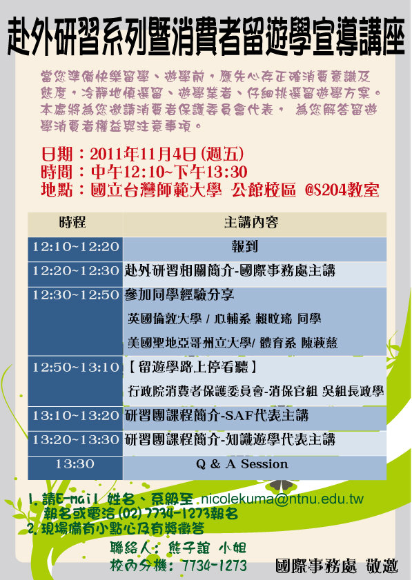 | 323 | 2011/10/25 | | 11月4日【赴外研習系列暨消費者留遊學講座】@公館S204教室 |