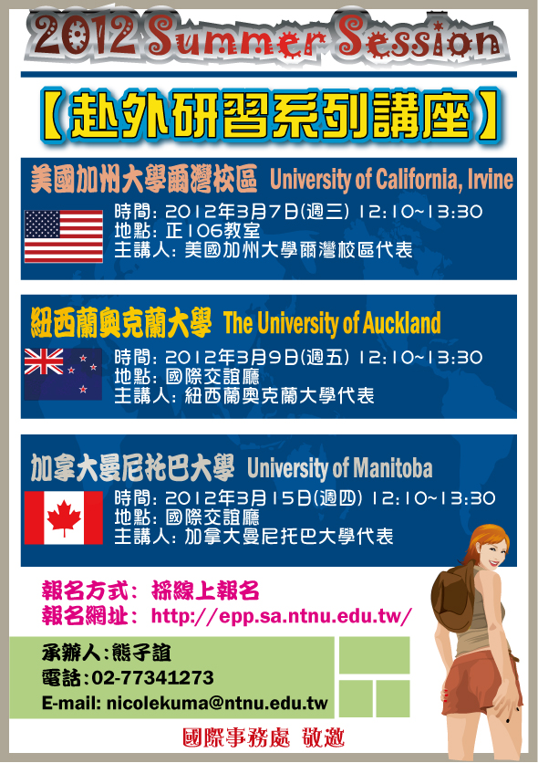 | 291 | 2012/10/02 | | 2013寒假語言文化研習課程【紐西蘭奧克蘭大學University of Auckland】(有隨行老師) |